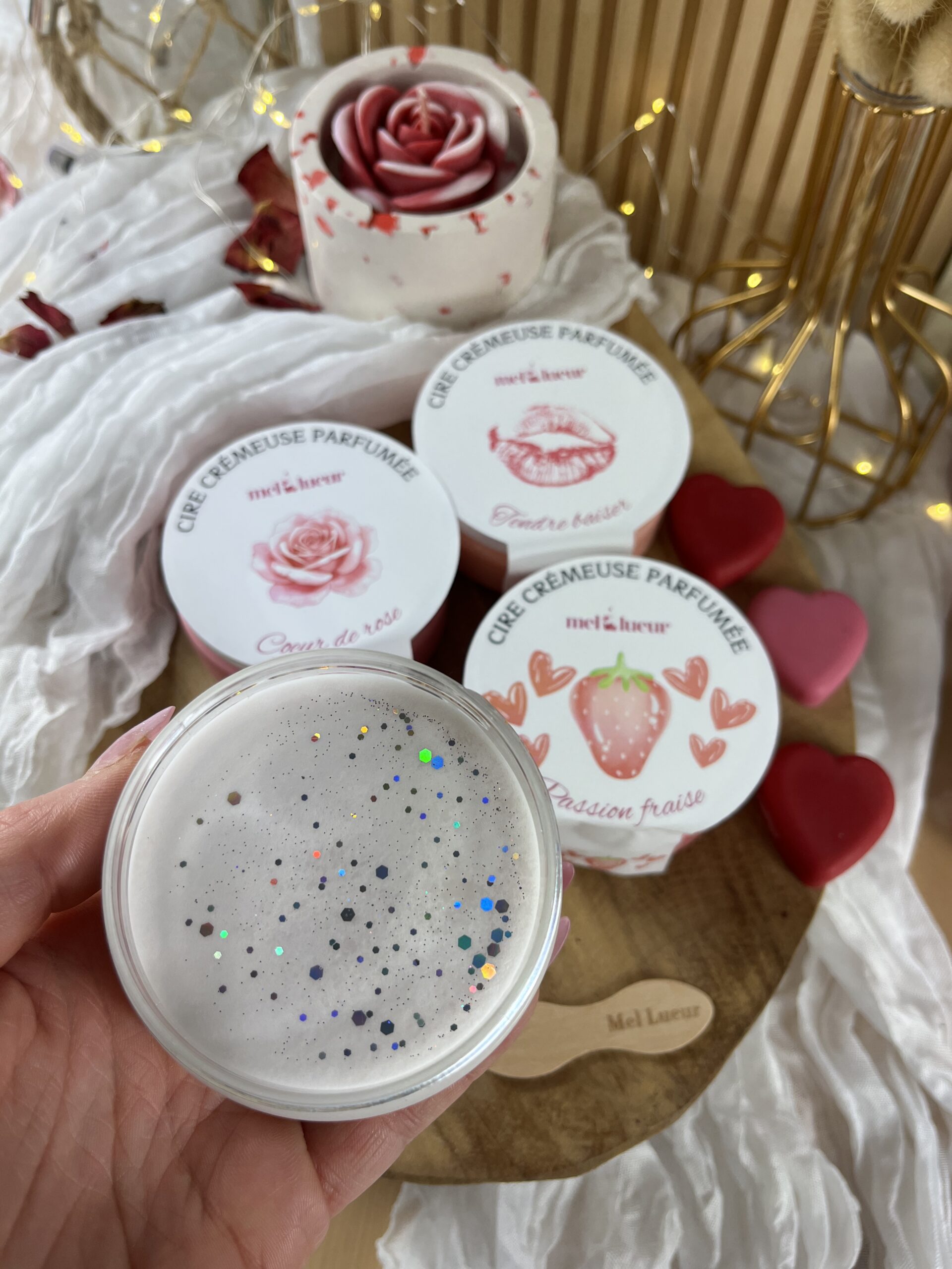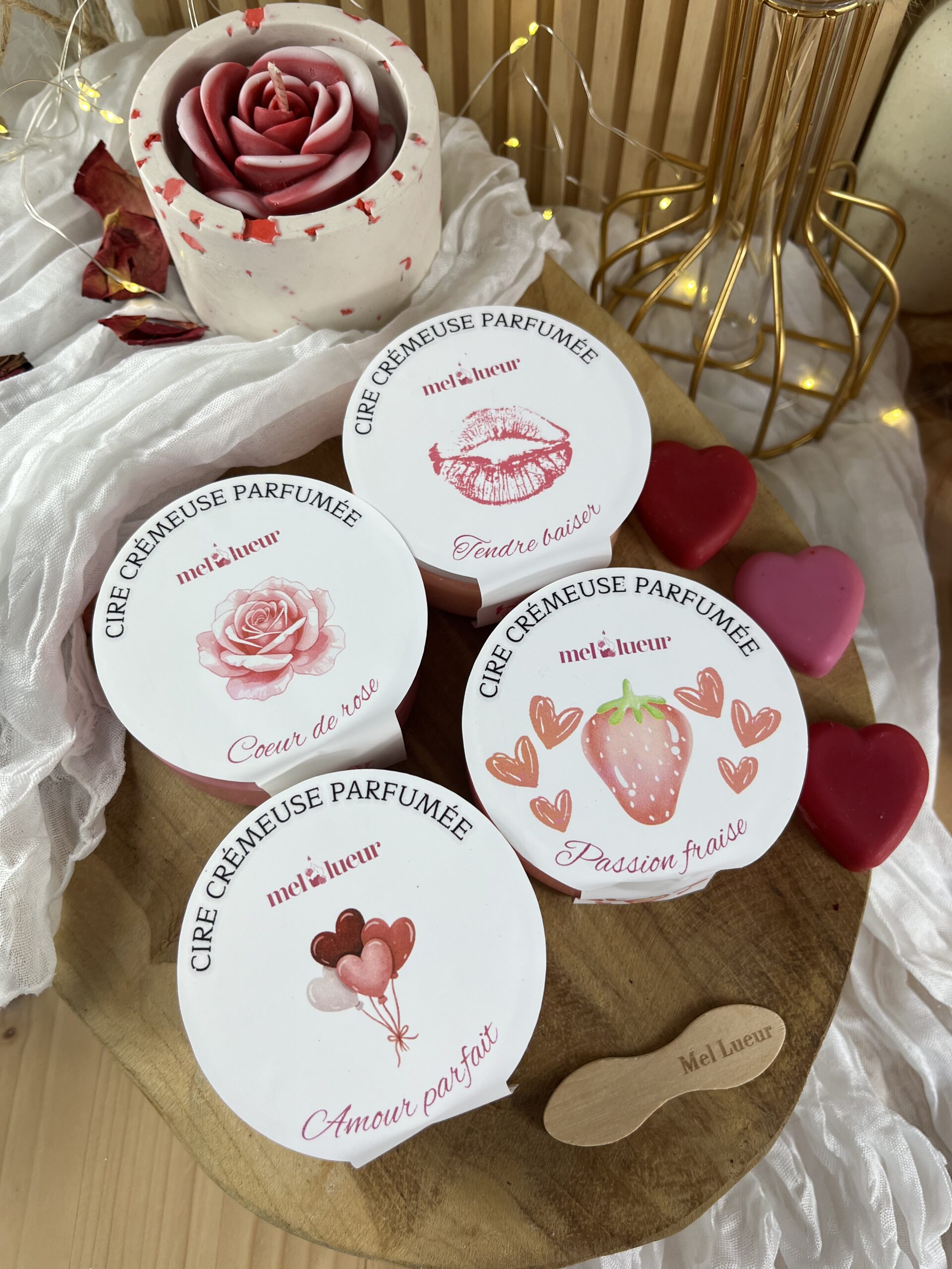 Parfum coeur de rose : Contient ACETATE GERANYLE(105-87-3), ALDEHYDE HEXYL CINNAMIQUE(101-86-0), CITRONELLOL(106-22-9), GERANIOL(106-24-1), ISO E SUPER(54464-57-2), METHYLIONONE GAMMA(127-51-5). Peut produire une réaction allergique.